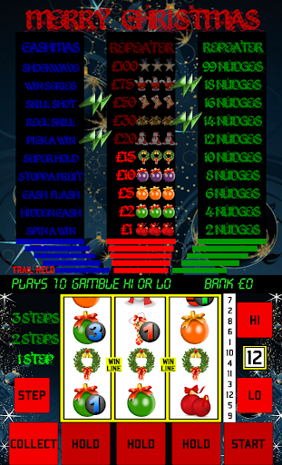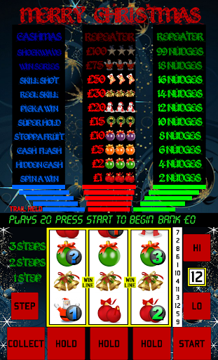 This fully featured UK style pub fruit machine plays just like your local pub gambler, and has a nice Christmas theme.