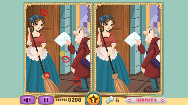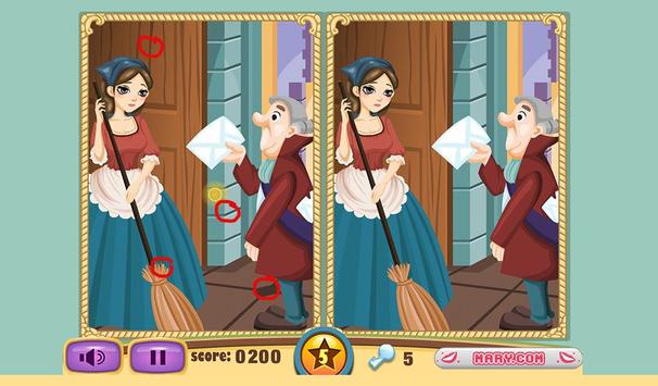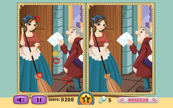 Do you know the story of Cinderella? Once upon a time there was a girl. After her mother died, her father got married to a new wife who had to daughters. The wife and the two daughters were very mean; they treated her unfairly and let her do all the dirty jobs in the whole house. One day, a letter of the king arrived, inviting all the pretty girls in the country to come to his castle. This would allow his son to choose the most beautiful girl of the country to get married with. Cinderella wanted to go, too, but the mean stepmother only offered a nice dress to her own daughters. Of course Cinderella couldn't appear at the king's castle wearing her old rags! When the stepmother and her daughters had left to the castle, a good fairy came to Cinderella. The fairy conjured up a beautiful ball gown and glass slippers for her. A pumpkin and two mice were transformed into a carriage with horses, but Cinderella must promise that she'll be home at 12 o'clock: after, the magic would be broken! At the castle the prince fell in love with beautiful Cinderella, but nobody knew who she was, even her stepmother and stepsisters didn't recognize her. Then the tower bells sounded twelve times and Cinderella rushed to get home. On her way, on the castle stairs, she lost one of her glass slippers. The prince traveled all through the country, in search of the girl whose foot the slipper would fit on. Each girl tried on the shoe, but the only one whose foot it fit on was Cinderella. The prince took Cinderella to his palace, where they got married and lived happily ever after! She has never had to clean anything again... In this game you'll read the whole story. Find all the differences and go for the highest score.