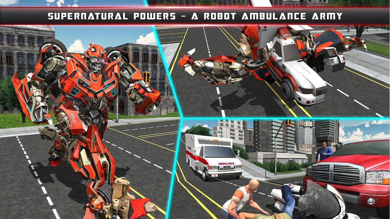 The best 3D models for ambulance simulator in ambulance transform robot and rescue bot games on this city ambulance rescue duty with robotic superheroes powers. Test your transforming ambulance robot games or robot ambulance games and shooting skills in the future robot wars. Play the rescue robot survival game with this fun to play robot ambulance gamewith warrior robot . The ultimate gameplay of the best action games or best robot action games to fight the criminals against humanity.