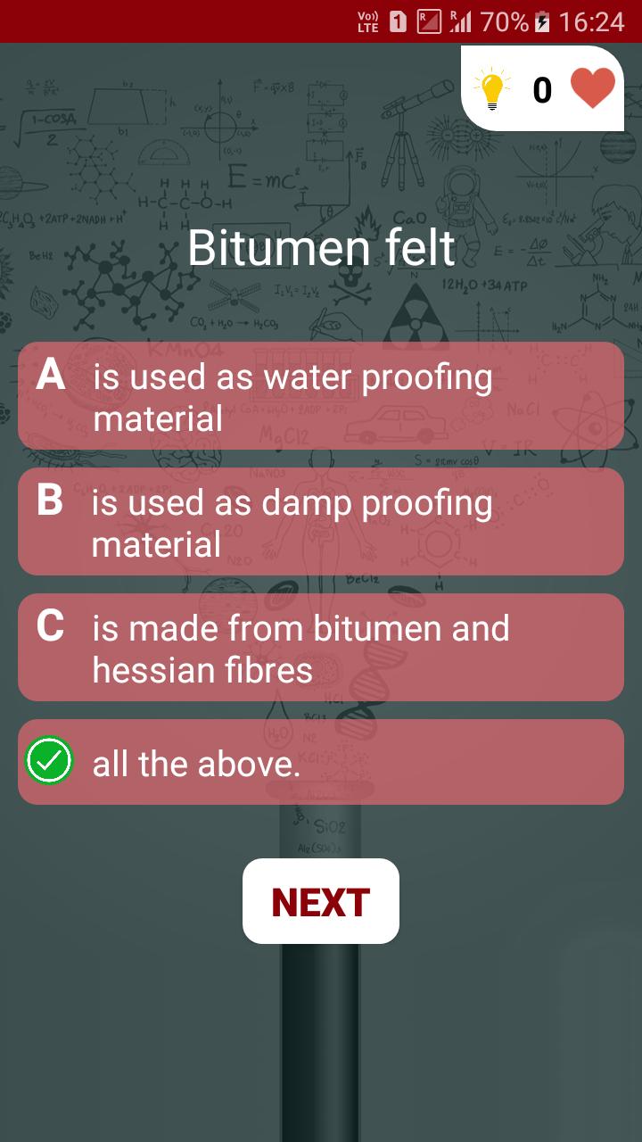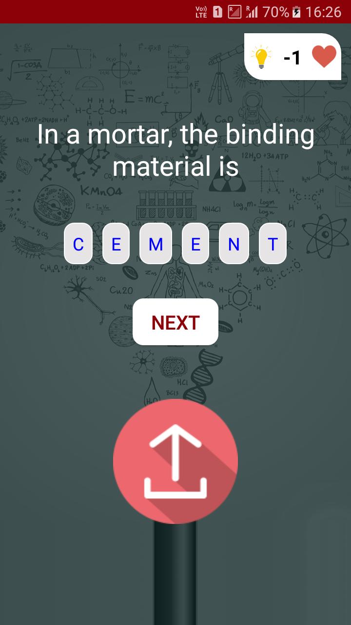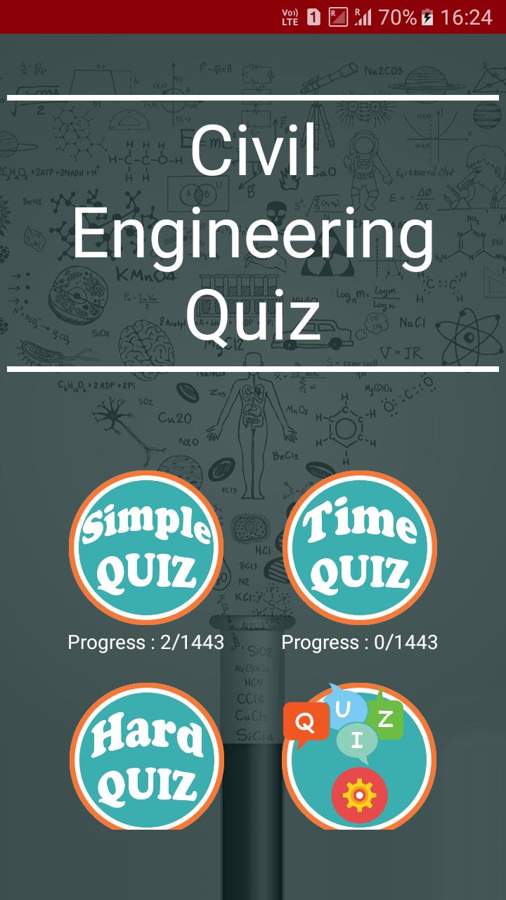 Using this Civil Engineering Quiz game learn, spend some free time with it, have fun playing it. It has 3 types which is simple quiz, time quiz and hard quiz.