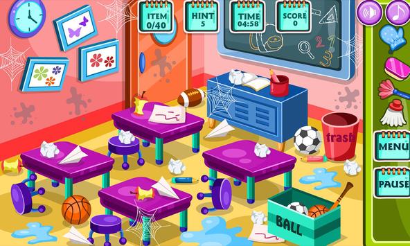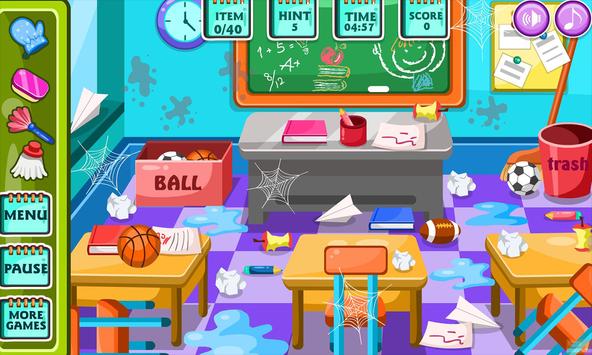 Create a nice clean classroom ready for learning with this clean up game. This fun game gives you the chance to show your cleaning skills by brushing the cobwebs, moping the floor, scrubbing the dirt from the walls, as well as placing the rubbish in the bin before organizing the toys and books. Once done you can admire your hard work with this clean up school game.