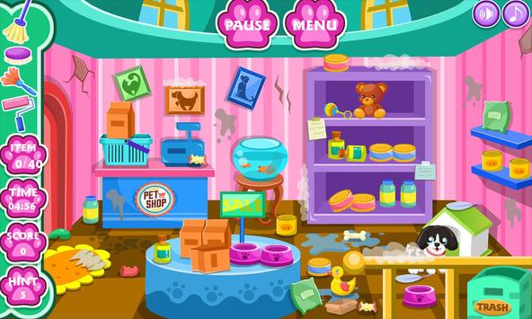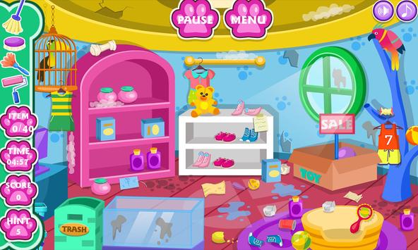 Let your pet shop be the best pet salon in town with this clean up game. Present your shop in a tidy fashion by cleaning it up well before the customers arrive. Here you can pick the rubbish up, sweep the floor, remove the dust, and straighten the products before painting the walls. Keep your puppy and kitty cats happy with this clean up game.