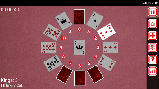 The game starts by dealing 4 cards each to 12 clock positions face-down. Remaining 4 cards are placed face-down at the center of the clock and top card of center pile is turned face-up. This card can then be moved to bottom of the pile at its respective clock position and top card of that pile is turned face-up which can again be played in similar fashion. The game continues in this fashion revealing top card and then moving that card to its clock position.