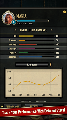 • View weekly and monthly graphs and in-depth statistics of your performance in Memory, Attention, Dexterity, Language and Reasoning games!
