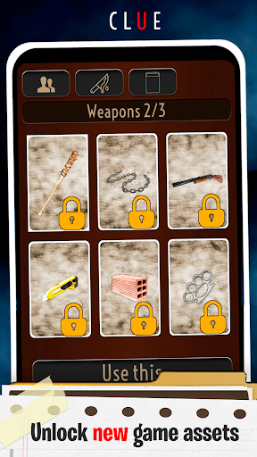 Candlestick, Dagger, Lead pipe, Revolver, Rope, Spanner, Chainsaw, Brick, Cutter, Shotgun. Unlock all weapons!