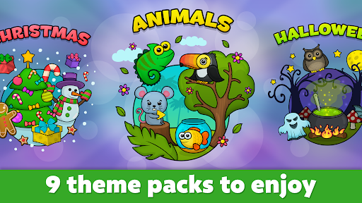 - Many interesting topics: animals, dinosaurs, fairy tales, sea, professions, sweets, space, Christmas and Halloween. Each topic will educate and entertain your child.