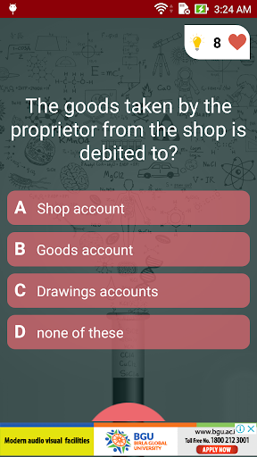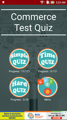 Using this Commerce Test Quiz game learn, spend some free time with it, have fun playing it. It has 3 types which is simple quiz, time quiz and hard quiz.