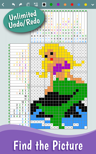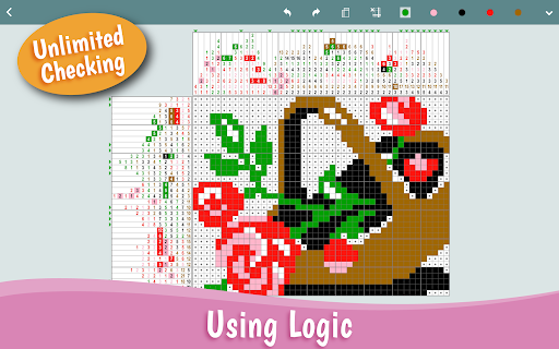 Paint squares as you solve the puzzle and discover a beautiful pixel-art picture! Each puzzle consists of a blank grid with clues on the left of every row and on the top of every column. The object is to reveal a hidden picture by painting blocks in each row and column so their length and sequence corresponds to the clues.