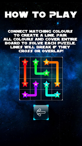 HOW TO PLAY? Connect matching colors to create a line to allow energy to flow. Pair all colors and cover entire board to solve each puzzle. Lines will break if they cross or overlap!