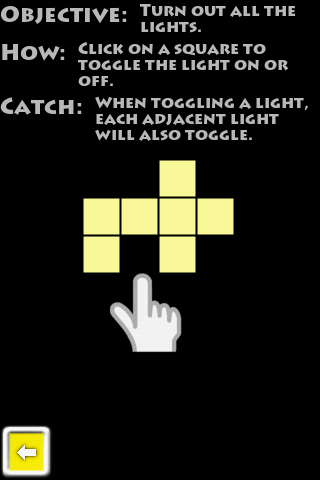 The object is simple, turn out all the lights… but there is a catch of course. When toggling a light on or off, each adjacent light will also toggle. Who wired these houses? This challenging game requires logic, skill and luck to solve each puzzle. The levels start off easy but progressively get harder. Good luck!