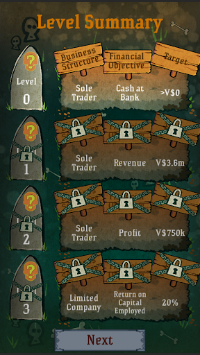 As you prove your accounting and finance literacy and your business successfully meets its financial objectives, you progress through to new levels, which unlock new business features, new financial data and new challenges.