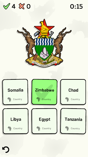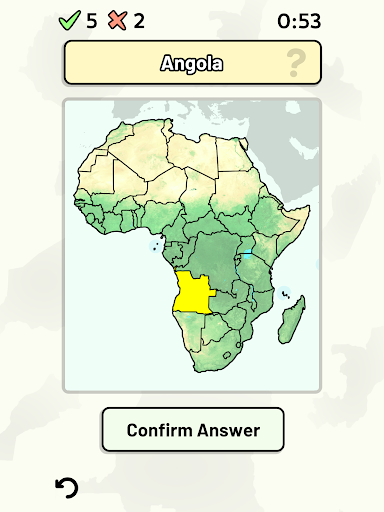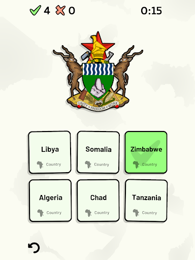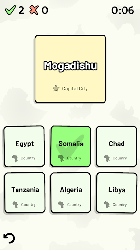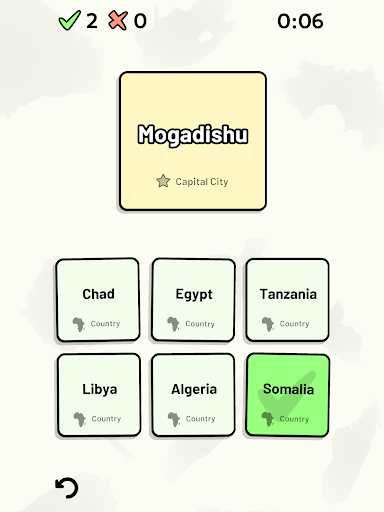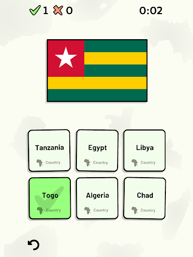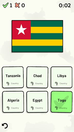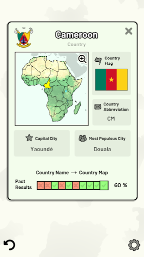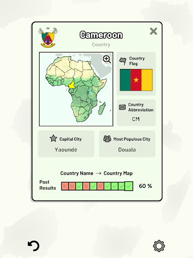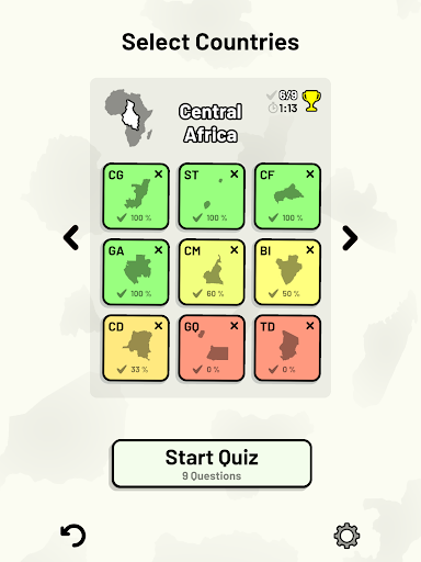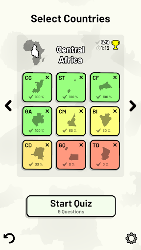 Customizable quizzes allow you to choose which African countries to test, as well as the topic. Past results for each African country are displayed to highlight your progress at each topic. Standard quizzes allow you to learn each topic by progressing through a series of levels, each covering additional countries.