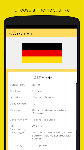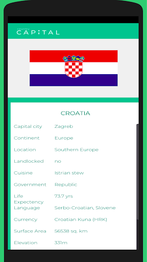 Learn about countries and test your skills with quizzes. With practice, you will be able to quickly identify the country from the flag and vice versa. You will know the capital cities throughout the world. You will have a broader understanding of people around the world with their cuisine, type of government, geography, and economy.