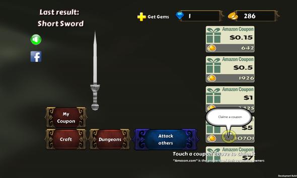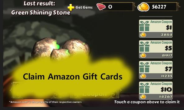 The game Coupon Forge gives you 300 gold at start. You use your "gold" to purchase different stones for different amounts. There are around 40 different stones. For instance, you buy a white diamond for 96 golds. Now your diamond turns into a weapon such as sword. Now you use the gems to enchant (upgrade) your weapon which in turn make it worth more gold coins. Then I sell the upgraded weapon to make more gold. With that gold you can get amazon gift cards. Easy and fun?