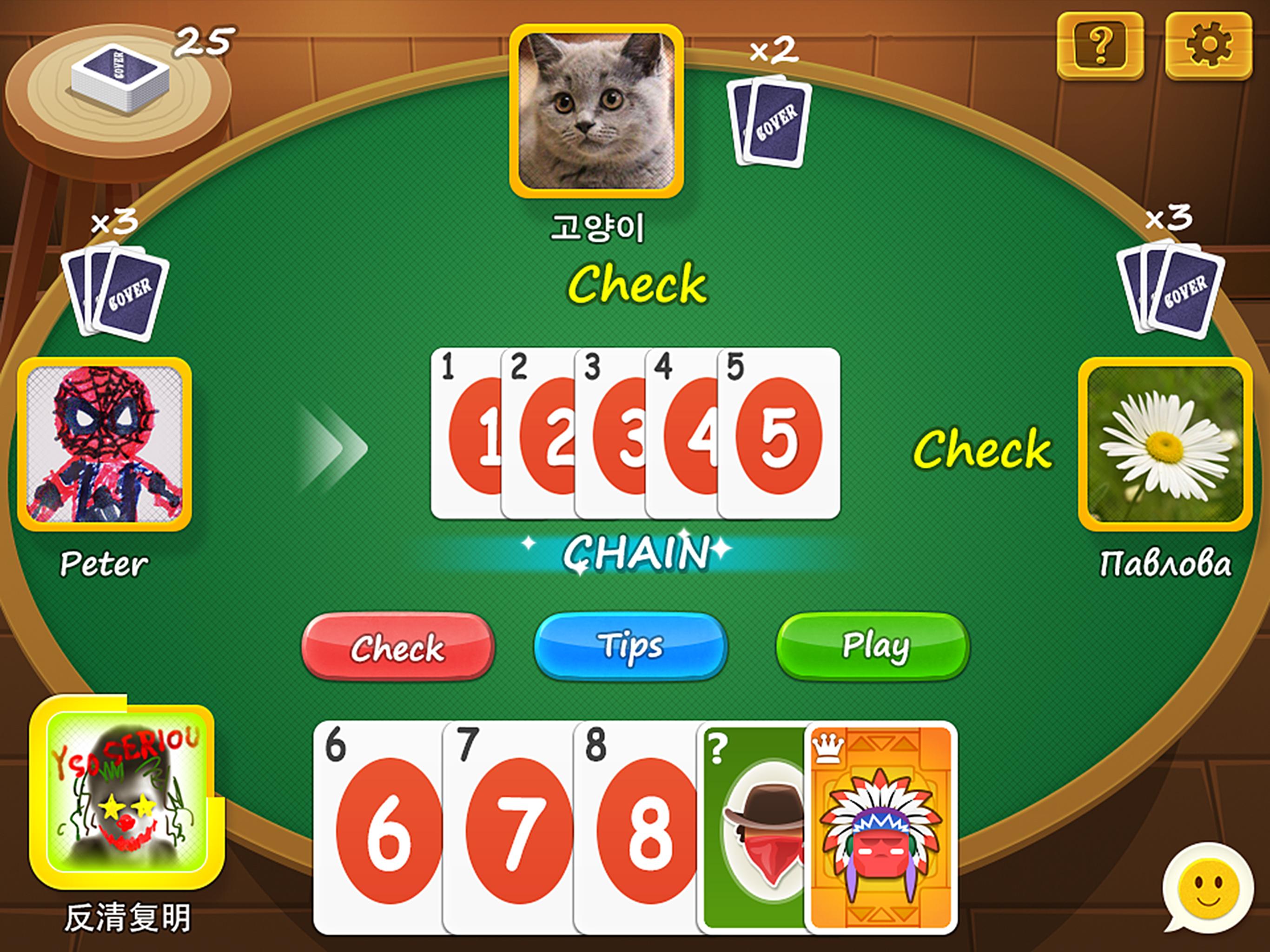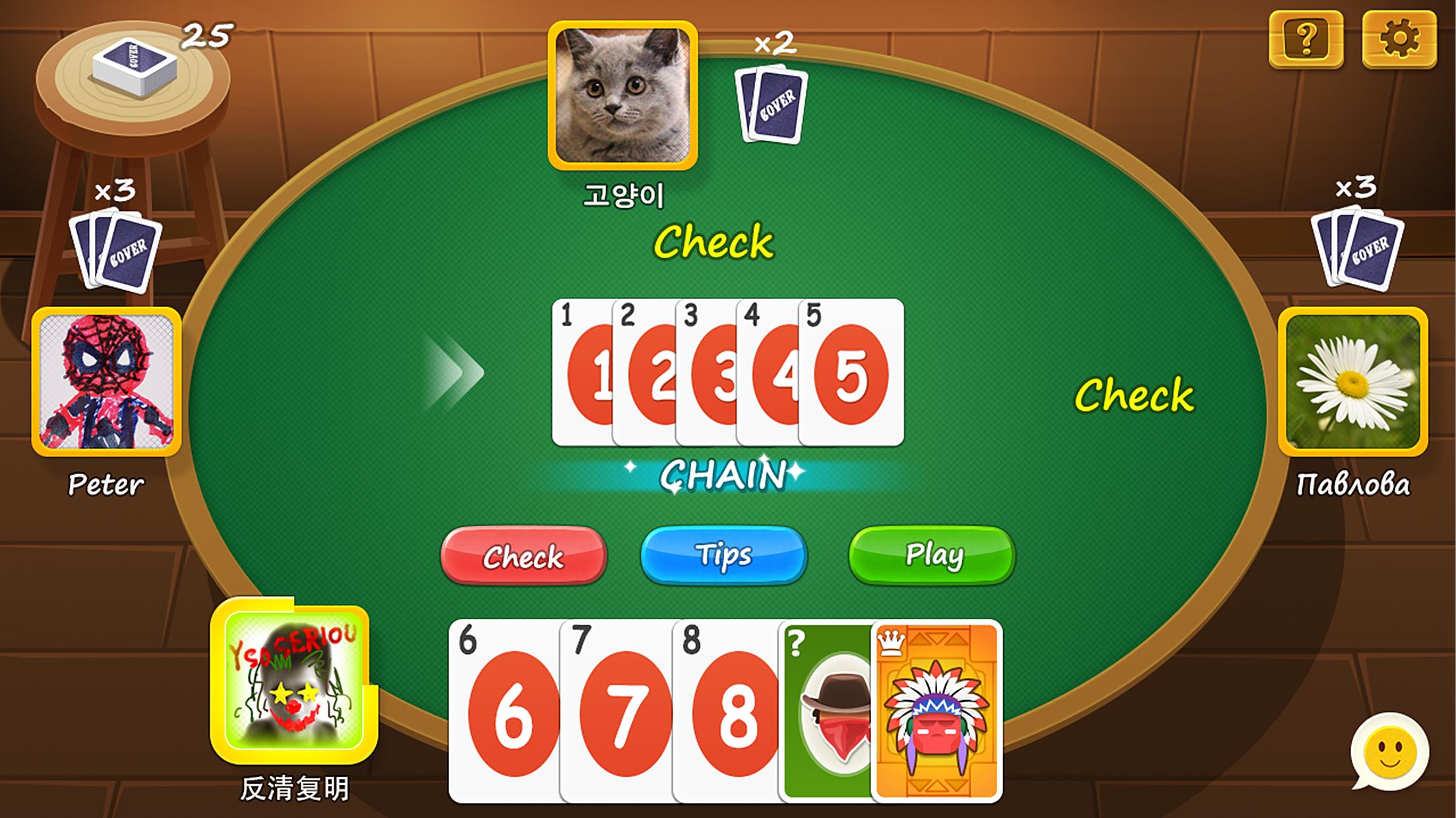 You can tap “CHECK” button to skip your round, if you can’t (or don’t want to) cover the poker cards played by previous player.