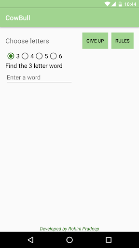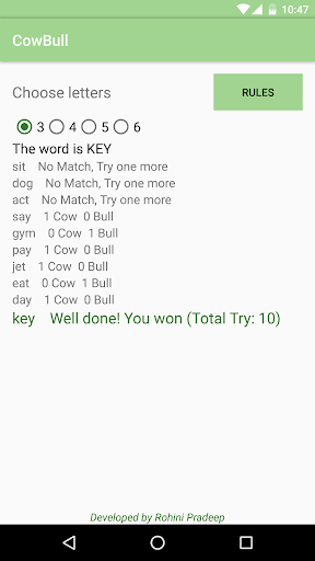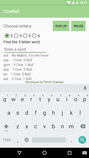 Cow Bull Word Game is also known as MasterMind. Mobile thinks an X letter word. The player tries to find it. X is selected by the player. At each turn, mobile says how close the answer is by giving a tip as below.