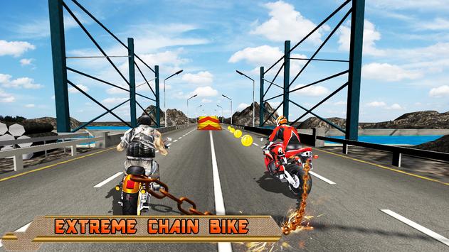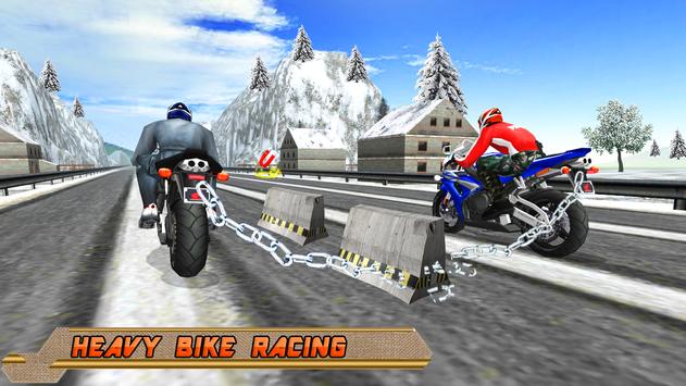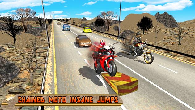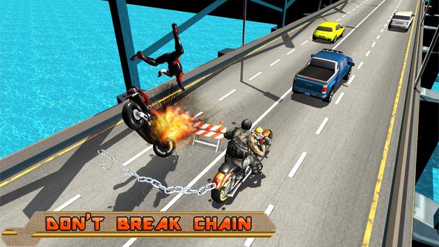 This chained bike speed race driving game is an adventure based chained motorbike simulator. Ultimate Chain Bike Traffic Race is for all challenging riders to prove their heavybike racing skills. Best bike chained race among the moto bike games and bike racing games 2017. Get ready to get some crazy chained bike race actions and stunts on ramp without chain break off. If chain break off bike will explode and the rival racing is gone. Chance to sharpen your crazy moto bike stunt riding abilities to practice race with grand Chain Bike Traffic Race GP. As a real dirt bike stunt rider do some illegal speed racing and break into each other. Perform the ultimate Moto stunts by keeping your chained bike partner along until you reach the destination. Get the directions on path and go on to start in snowy cities and mountains roads motor cycle riding.