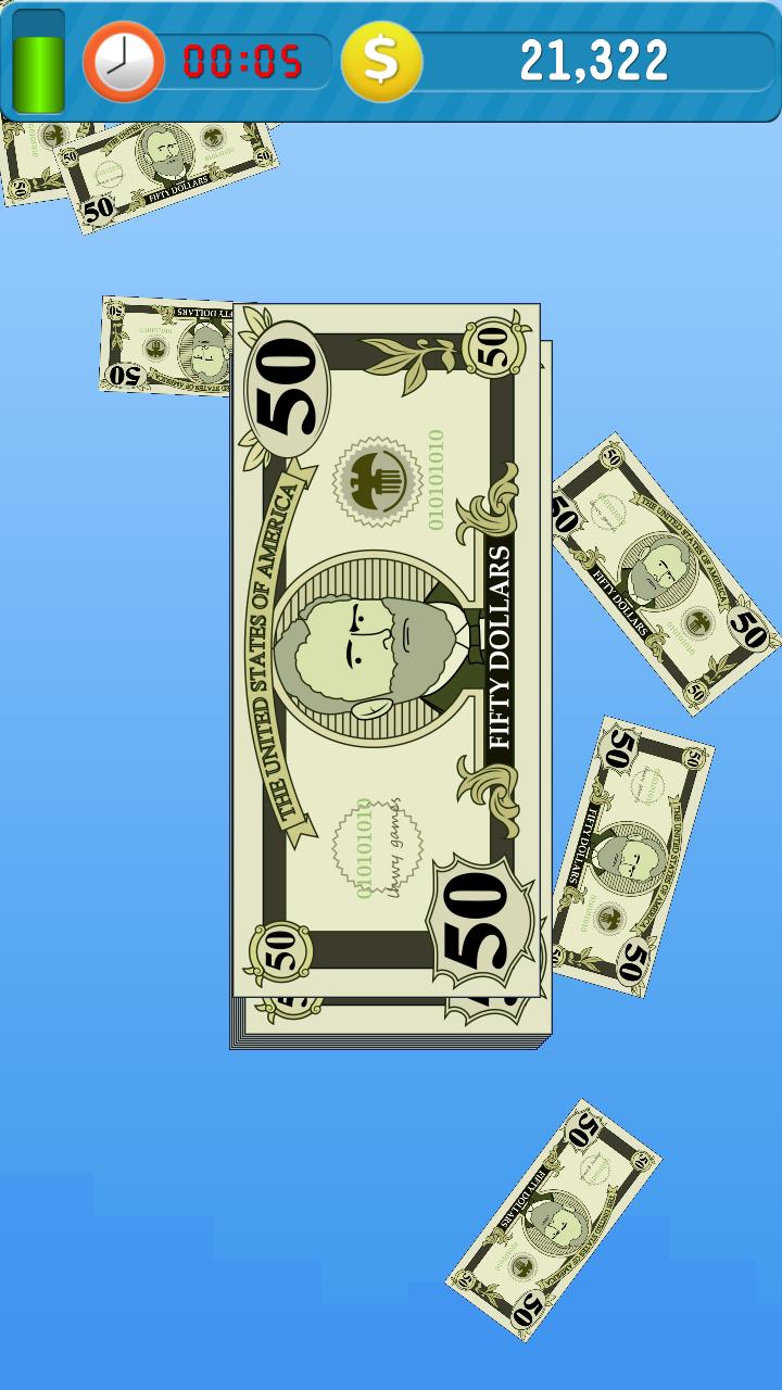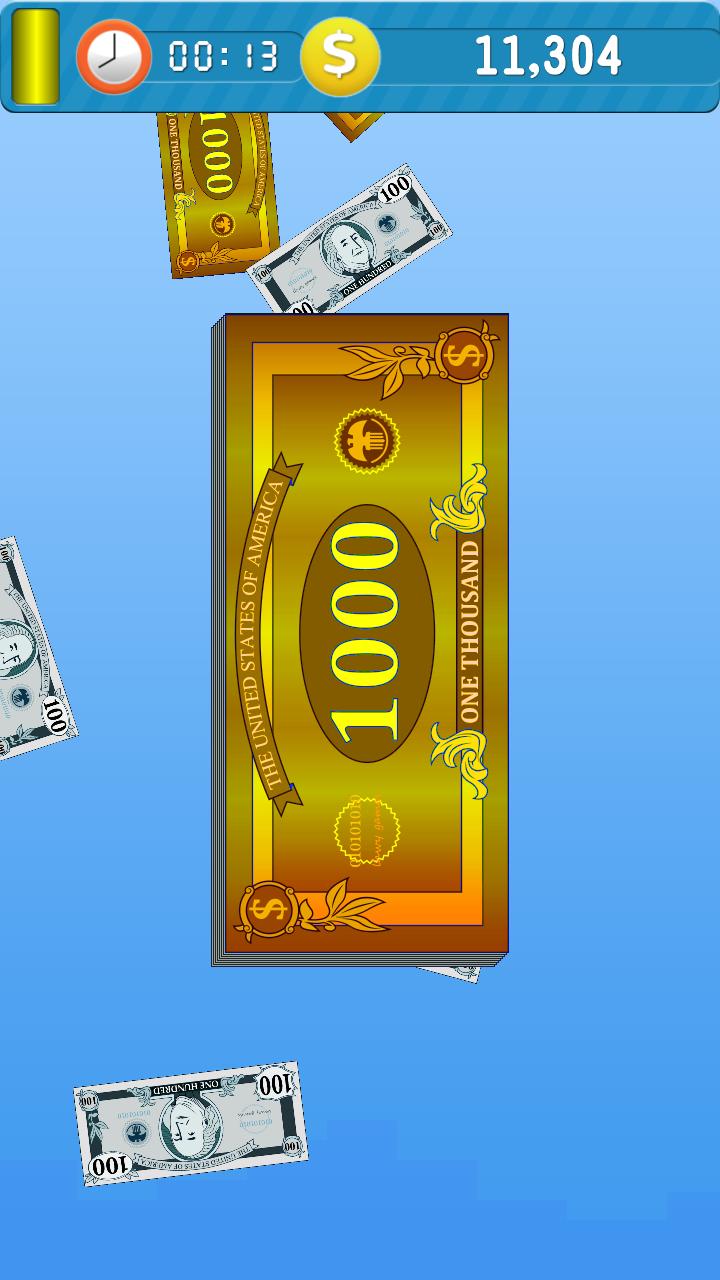 Swipe to make it rain cash. In the begginning it will rain only $1 each time, swipe swipe and swipe, it will become $2, $5, $10 ... and $1000! And when it becomes $1000, you will get 20 seconds additional time.