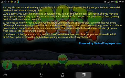 Crazy Shooter is an all new high-octane Android touch screen skill game that impels you to shoot down wild, irradiated, and absolutely angry birds using a bevy of weapons.