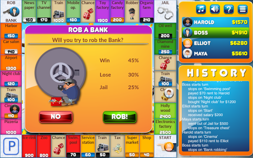 CrazyPoly is free turn based economic strategy game that allows you to buy business properties, build levels, collect rent, rob bank and so much more. The main objective is simple - bankrupt opponents! The key to be rich is to buy properties of the same color to create monopoly and build more levels to increase rent.