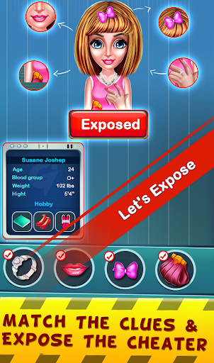 Every investigation story will consist of five love crime scenes in this interactive mystery games. Every crime scene has 5 hidden objects. So you need to notice what's the difference between two amazing pictures in the clue games, find 5 differences and complete the missing part of the evidence. There will be two best detectives to solve the love riddles in this interactive mystery game. One is field detective and the other one forensic detective. The objects adventure game demands your active observation skills to find the evidence hidden in the scenes. Discover different case related objects to find the cheater with the best brain game. Spot the differences and find the evidence against the cheater. Investigation games demand you to match the objects & choose the cheater partner who is the killer of the beautiful relationship.