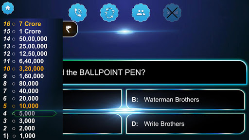 Crorepati Quiz Game 2019 ask a 16 question in each round with 4 lifeline as well it will help you to reach the higher level.You can win upto 7 crore in this game.This game will be very useful for the people who are preparing for the competitive exams like bank exams,ipl 2018 contests, PO, Clark, IPS, IAS, UPSC preparation and other exams preparations like SSC, hindi gk upsc, HSC and CBSC board,Railways, Civil Services, MBA exams.