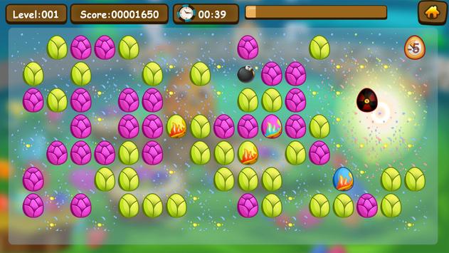 Timed - Complexity increases as new eggs arrive from bottom and you need to be quick to complete the level. If the eggs reaches top, game over! There is a time limit to complete the level. Crush certain number of eggs in limited time to complete the level.