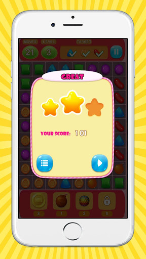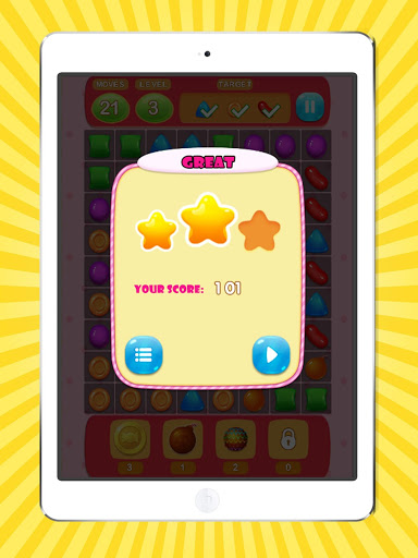 Fun free play candy land and get items sweet boosters (gold coin, explode bomb and sweet booster) that will help you succeed and blast all the sweet candies to win the levels.