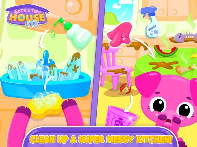 Help cute piggy Lulu clean up a super messy kitchen! Throw away trash and wash the dishes! Good job, little helper!