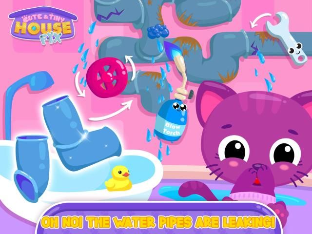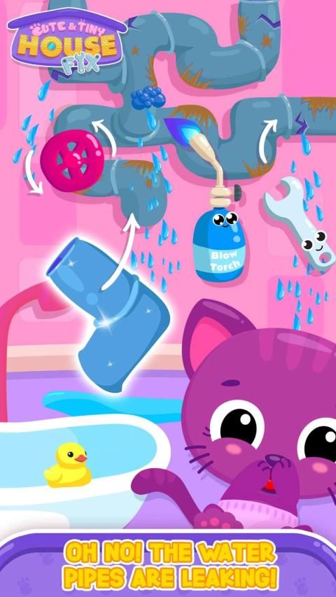 Oh no, the water pipes are leaking! Repair them with cute kitty Sue! Good job! Now baby cat girl Sue can take a bubble bath!