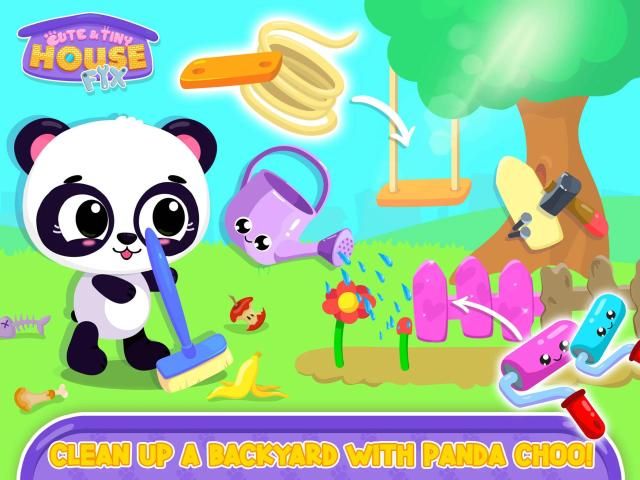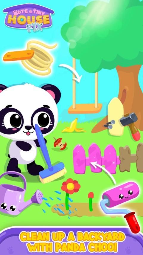 Clean up a tiny backyard with panda Choo! Fix, build and paint a new fence! Grow beautiful flowers! Make fun swings for kids on a tree!