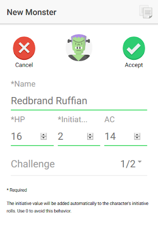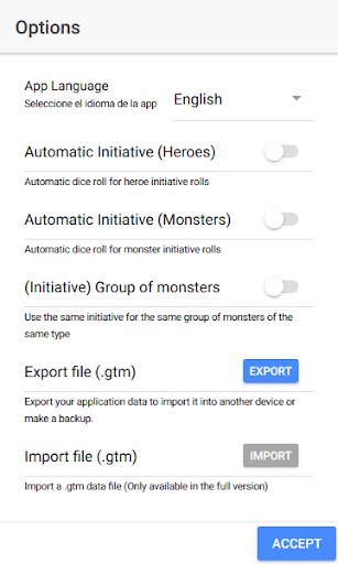 DMTool - Initiative Tracker is the app that you need when you play Dungeons and Dragons like a DM role. will allow you to track combat in a very agile and intuitive way. It has preloaded a database of 325 monsters with their initiatives and points of life. You just need to create the game, enter the heroes and choose the characters involved in the combat.