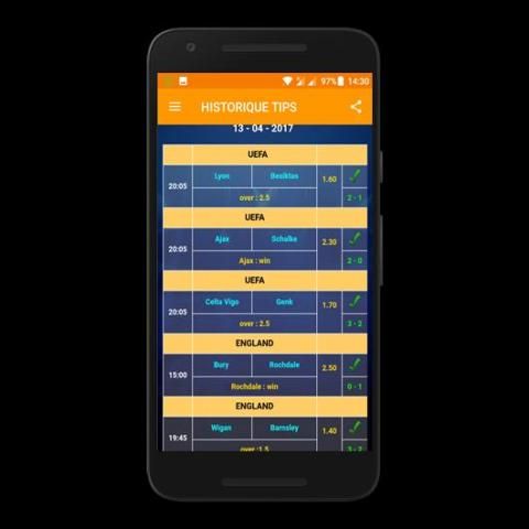 DAILY BETTING TIPS application gives you predictions categorized such as surprises, mostly-guaranteed, first half and full time, high odds and many more tips everyday from the popular leagues.
