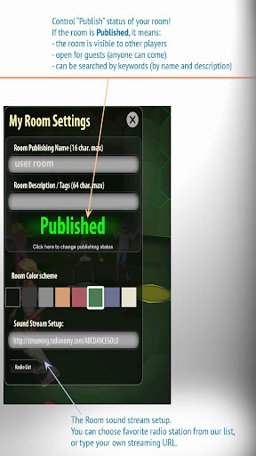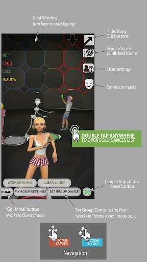 Drive your avatar! Play favorite dances! Manage own parties! Meet friends and dance altogether in 3D environment!
