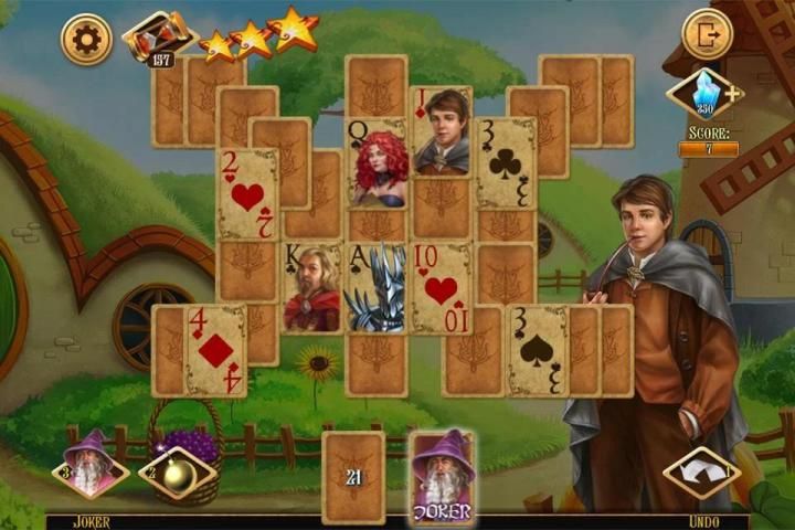 Help the little hobbit to get the magic sword to beat the dragon and dark forces! The magic sword is saved in Mordor, so the journey is long and dangerous, you have to pass various magic lands and meet evil and mysterious creatures: elves, orcs, dwarves etc. Your goal is to remove all cards to the foundation, by selecting cards that are one higher or one lower than the open cards. You can use the joker to replace any card.