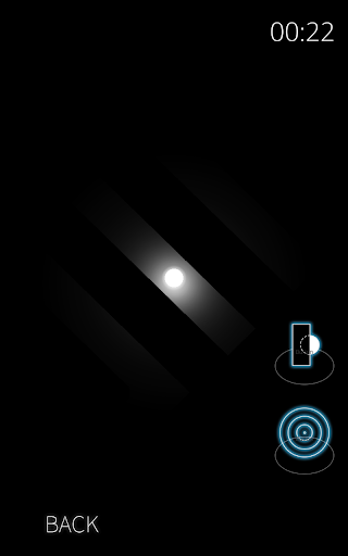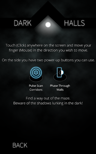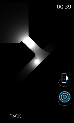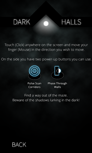 Player is a small ball of light in a dark maze. The only light source is the player itself. Nothing reflects light. Be wary of the shadows that lurk inside the maze. They can extinguish your light. Play 48 (and more are on the way) maze designs. Touch anywhere on the screen and move your finger in the direction you wish to move. On the right side of the screen you have two power-up buttons you can use. Try not to hit the walls. If you do it hard enough you will be temporarily incapacitated. Get out of the maze as fast as you can. You will recognize the exit by the bright white light.