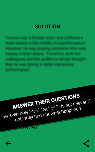 Then he/she reads its solution without telling the other people. The rest of the players then have to make questions in order to solve the mystery.