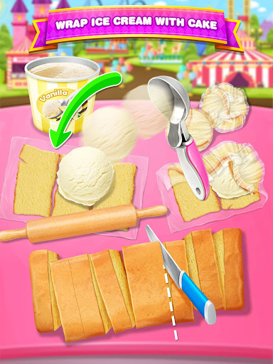 Roll the cake piece, and the scoop the ice cream to the cake pieces. Tap to wrap the ice cream. Do not let it spill.