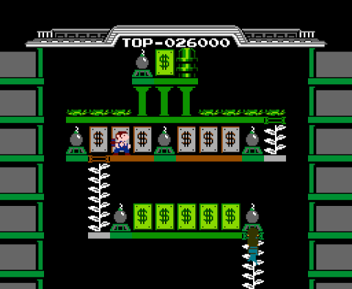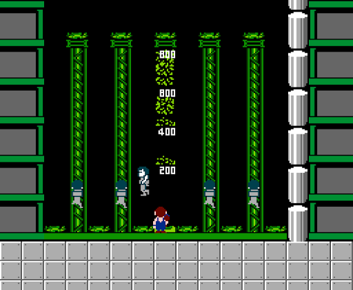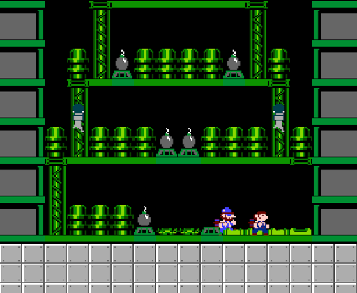 GREEN BEAMS - Takes one hit to knock down - anything on top of it will also come down(make sure a barrel is not above the beam or else the barrel will fall on you and you'll be stuck INSIDE the barrel! If this does happen, press Select to go to the title screen, and press Start to start the game.