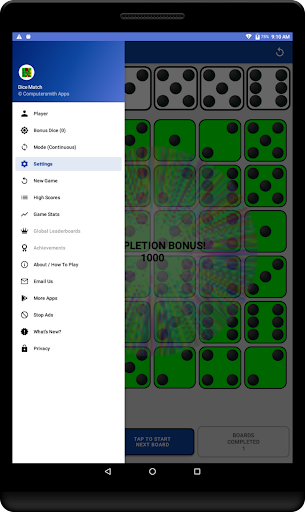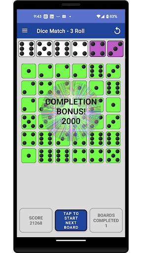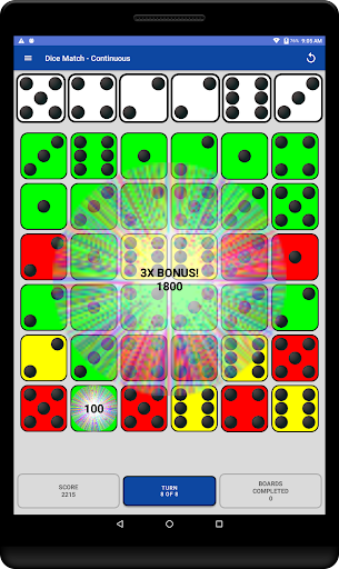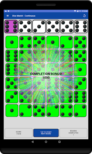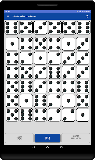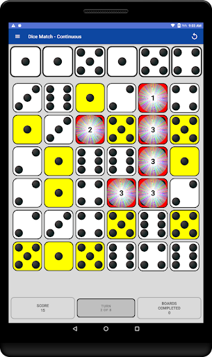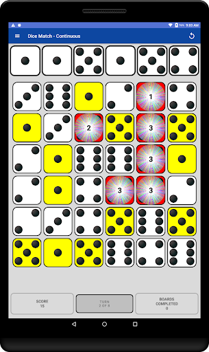 In Continuous Mode your game doesn't finish when you complete a board. Instead, a new board is set up & your score is carried over. You also get any rolls you had left from the previous board added to your Rolls Left total in the new board. Continuous mode is great for challenging yourself to see how many boards you can finish in a row! If you fail to complete a board before you run out of turns, the game is over & the Boards Completed counter is reset to 0 when you start a new game.