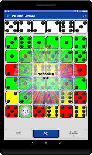 Maximize your score by completing multiple rows in a turn. Fill the board from the inside out or outside in & hold off completing rows for as long as possible. Try to have many with only 1 die left to select so that when you start completing rows, you can complete as many as possible per turn. This will earn you the highest bonuses. Completing a board in less than 8 turns (Standard & Continuous modes) will earn you a bonus (the less turns, the higher the bonus) & completing multiple boards in Continuous mode will earn you big scores. You can also use up to 2 bonus dice (if you have them) to get you over the line. Good luck!