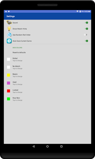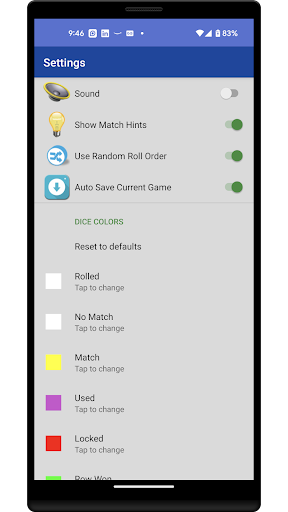 There are 6 dice along the top & a game board of 36 dice that are randomly allocated values at the start of the game. Tap on the Start button to take your first roll. If the 'Show Match Hints' option in Settings is turned on (default), any dice on the board that match any number rolled at the top will be highlighted. As you select matches by tapping the dice on the board, your selection & its matching rolled die will change color. To deselect a die & its matching rolled die, tap it again. You can also move a match by tapping on any other matched die with the same value that isn't already locked.