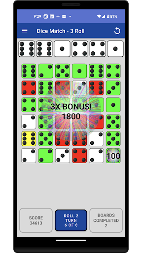 In 3 Roll Mode you get 3 rolls per turn & 7 turns per game. After each roll you can choose which matches to keep by tapping on them. The corresponding rolled dice are kept out of the next roll. If you match all 6 rolled dice in rolls 1 or 2, you forfeit the remaining rolls for that turn. 3 Roll Mode is continuous - ie: if you complete a board, your score & unused turns are carried over to a new board. Note though, you can only have a maximum of 10 turns at the start of a board.