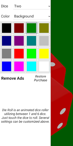 Die Roll is an animated dice roller utilizing between 1 and 6 dice. Just touch the dice to roll. Dice colors and background can be customized.