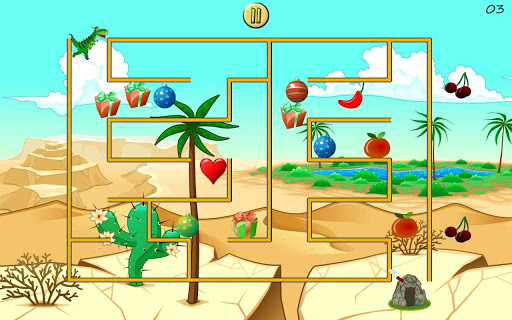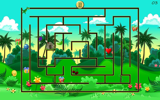 In each maze, children will have an outline of the maze. Your child will then pick dino and move him along the maze lines, trying to find the way home. on the way,your kid can pick lots of presents and artifacts before reaching home. Each present taken provides a colorful positive feedback to the kid amusement. Once kids bring the little dino home, the maze is complete. A pleasant voice congratulates the kids on a their great work. In addition, the dino and his home grows to full view with light fireworks in the background.