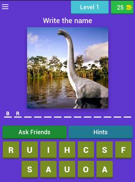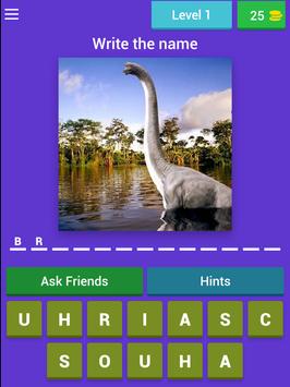 Welcome to the ancient times, 150 million years ago, when the Earth was inhabited by giant predators - the dinosaurs. The game takes you into the world of danger and adventure. But the entrance into this world is open only to those who are absolutely sure in their knowledge of all the names of species of dinosaurs. Guess the name of the dinosaur shown in the picture and get coins for the right answer. Use the tips and pass all