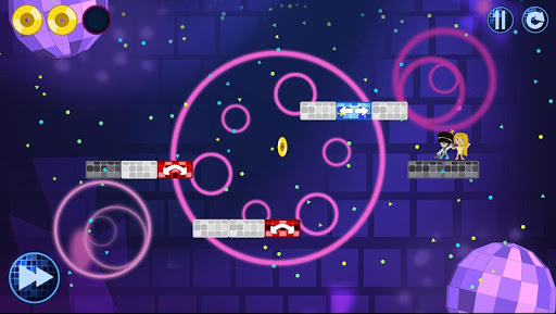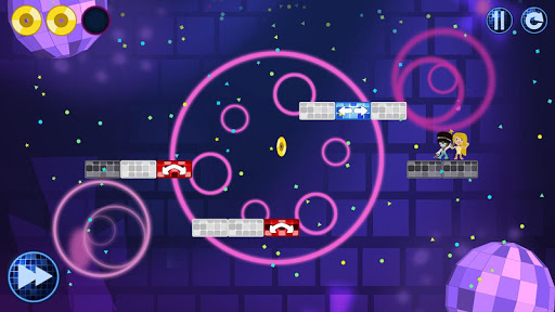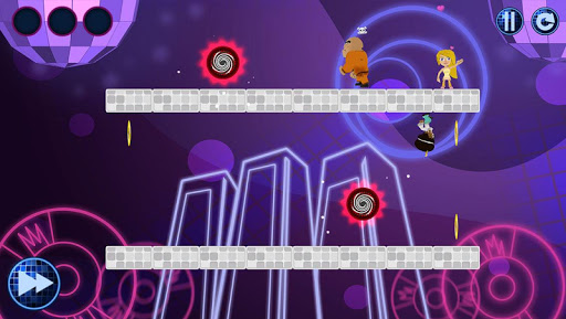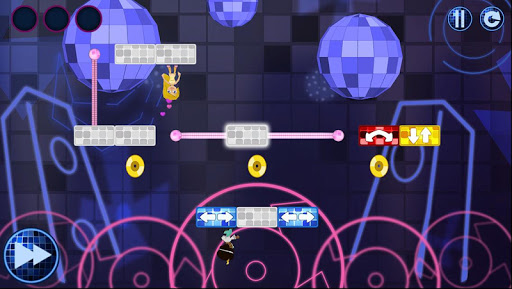 By touching certain tiles, the player changes the platform, making the character jump, invert gravity or turn around. Control the path of a disco-dancer leading him toward his girlfriend while collecting discs and avoiding security guards along the way!