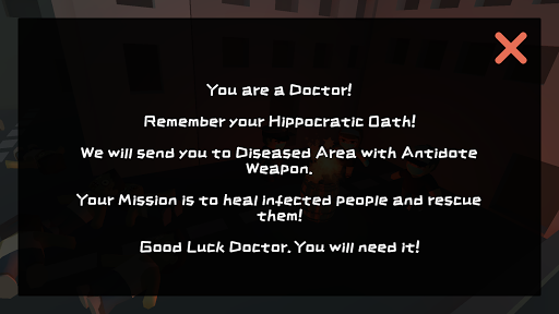 Remember your Hippocratic Oath! We will send you to Diseased Area with Antidote Weapon. Your Mission is to heal infected people and rescue them!