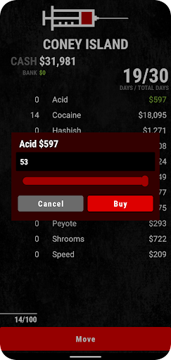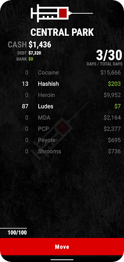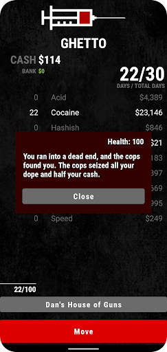 But it's not that easy, some bad things can occur during your move, such as muggings, and cops. Fortunatly, good things can occur too, like finding drugs on a corpse, buying extra pockets, or meeting a nice friend.