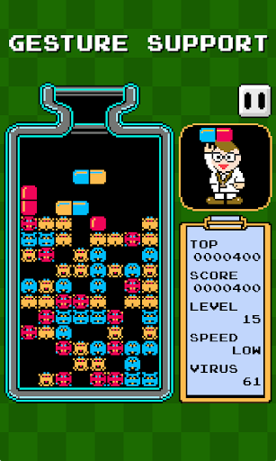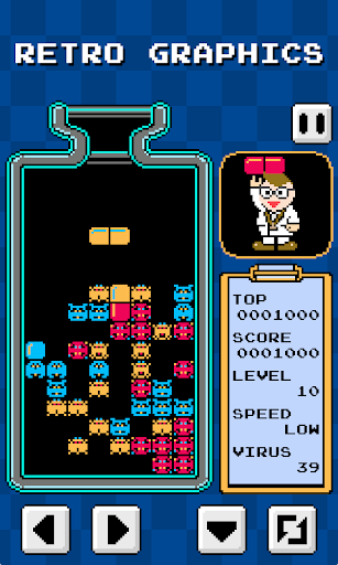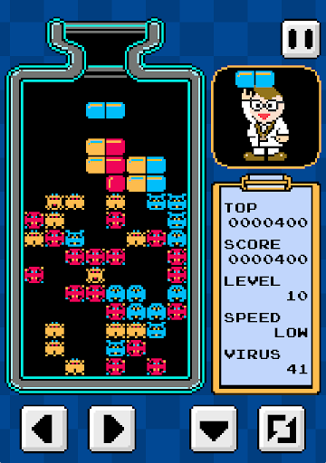 Dr. Virus is a falling block puzzle game. The player's objective is to destroy the viruses by using colored capsules that are tossed into the bottle. The player manipulates each capsule as it falls, with the goal being to align similar colors which removes the viruses. The player progresses through the game by eliminating all the viruses on the screen in each level.